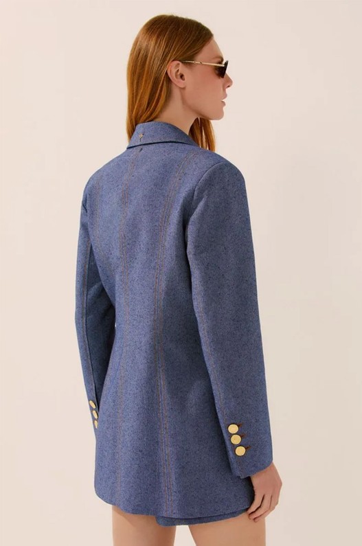 Um clássico da alfaiataria, o blazer feminino surge no mix Alfaiataria Urbana em denim, inspirando toque moderno que garante toque refrescante no seu closet. Peça elegante e versátil que adiciona sofisticação a qualquer look, este modelo de blazer feminino tem uma modelagem regular, com um corte clássico e mais amplo, proporcionando conforto e caimento adequado. Confeccionado em material tipo denim, o modelo também ganha aplicação de rebites dourados e bolsos frontais falsos. Aposte no blazer ÁGUA DE COCO pode ser usado em diferentes ocasiões, desde eventos formais até produções mais casuais e descontraídas.