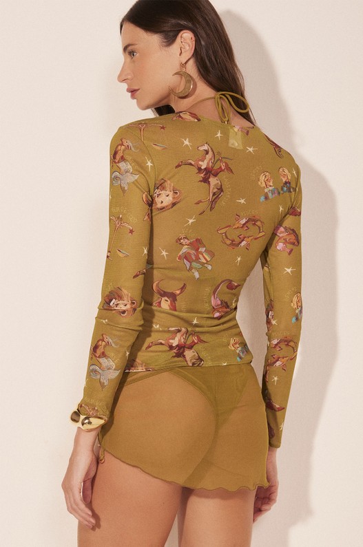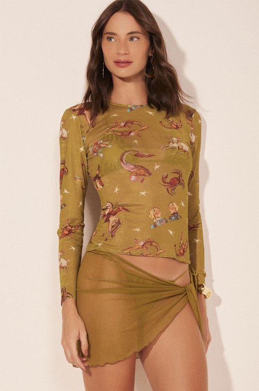 Blusa manga longa Zodíaco, confeccionada em Tule. Sofisticação ao visual, enquanto a estampa dos signos dá um toque moderno.