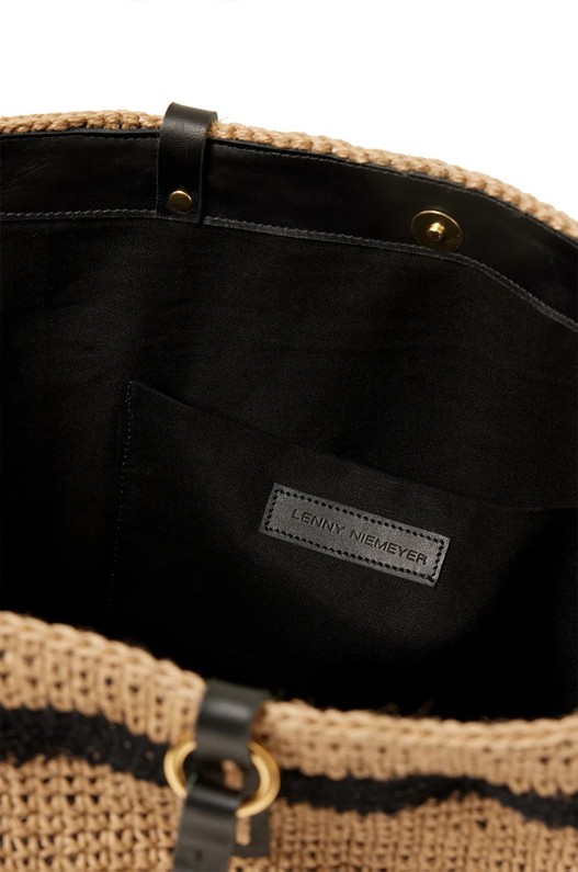 • Bolsa grande feita de crochê manual em fio de Rami com listras nas cores natural e preto. Alça e detalhes em couro preto, argolas de metal, forro em linho e bolso interno.