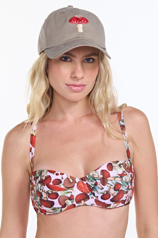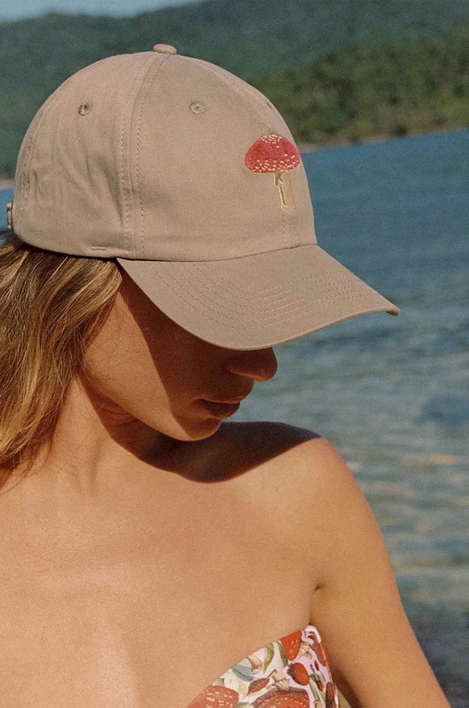 Boné aba curva, com bordado localizado na frente com estampa exclusiva ´Cogumelo´.