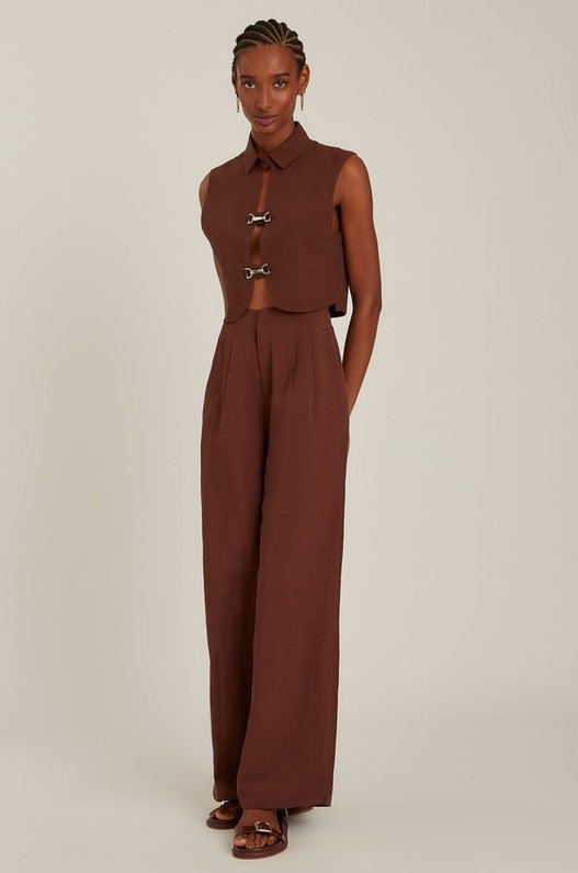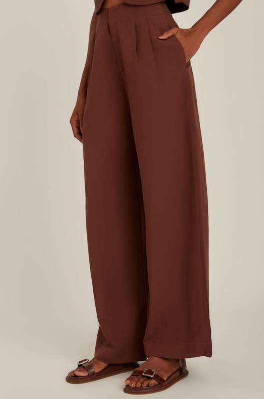 Calça feita em viscose com linho, da Collab Lenny + Misci. Possui cós de alfaiataria, fechamento de colchete, pregas na frente e bolso faca. Apresenta modelagem reta, com a perna levemente aberta em direção à boca. A calça alfaiataria é super confortável e tem caimento elegante ao corpo, permitindo uma produção elegante.