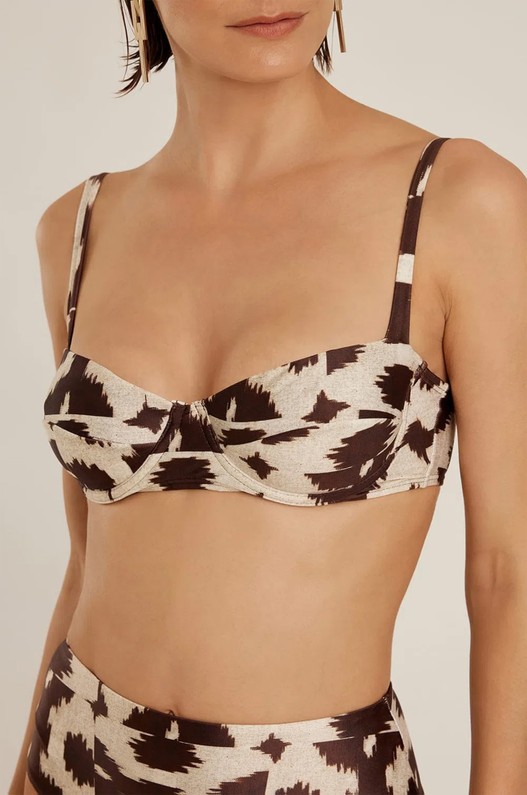 PUGLIA: Inspirada na região de Puglia na Itália, a estampa traz um ikat clássico da marca em um patchwork geométrico, trabalhado com texturas de linho em um bicolor de café e off white.