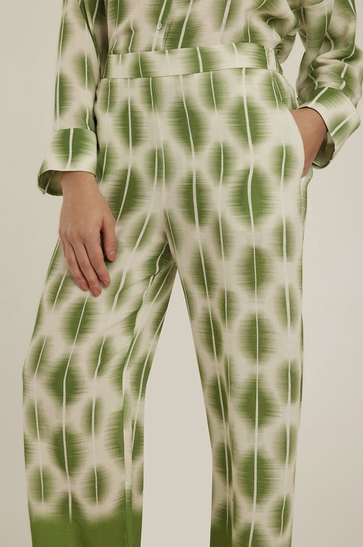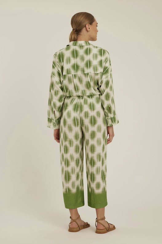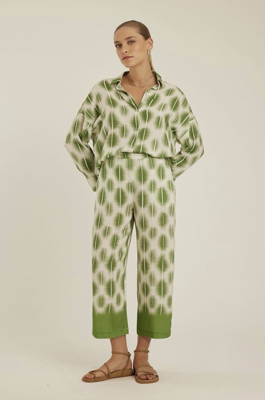 JACARTA: Uma interpretação do tradicional ikat, a estampa Jacarta é um listrado vertical verde matcha, com peças especiais com barrado.