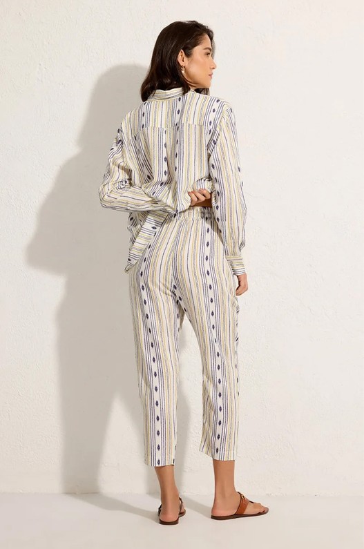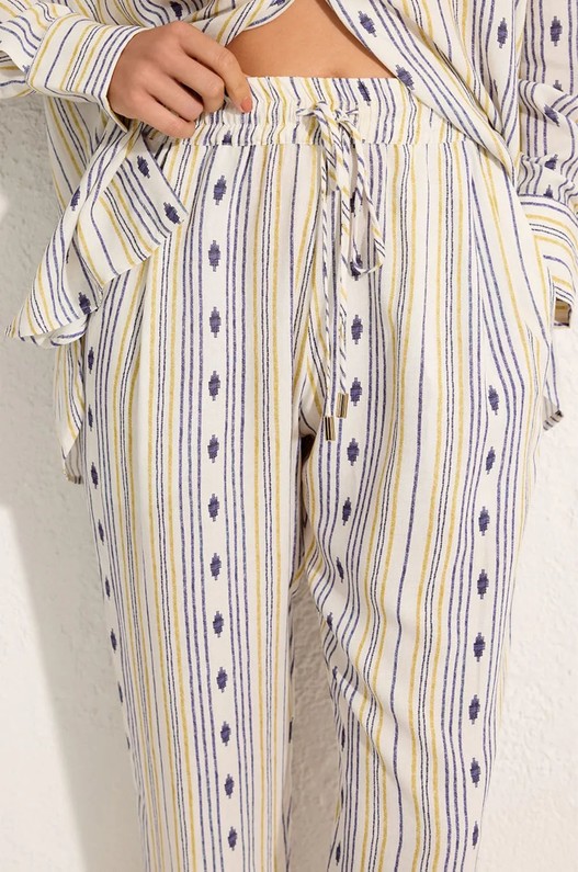 ESTAMPA WALLY: Combina listras finas em azul e amarelo com pequenos detalhes bordados, criando efeito rítmico sobre fundo claro, que avoca estilo artesanal em contraponto com sua versão de fundo marinho.