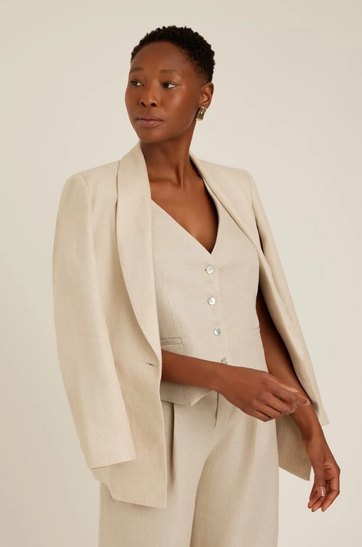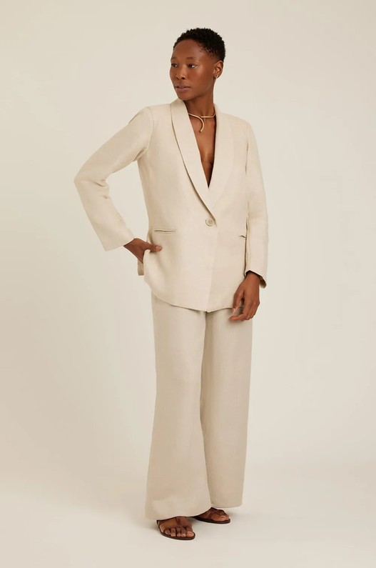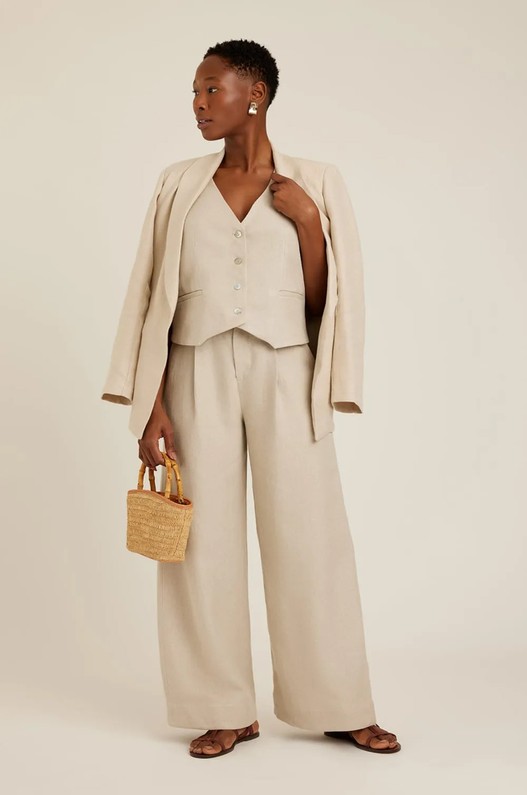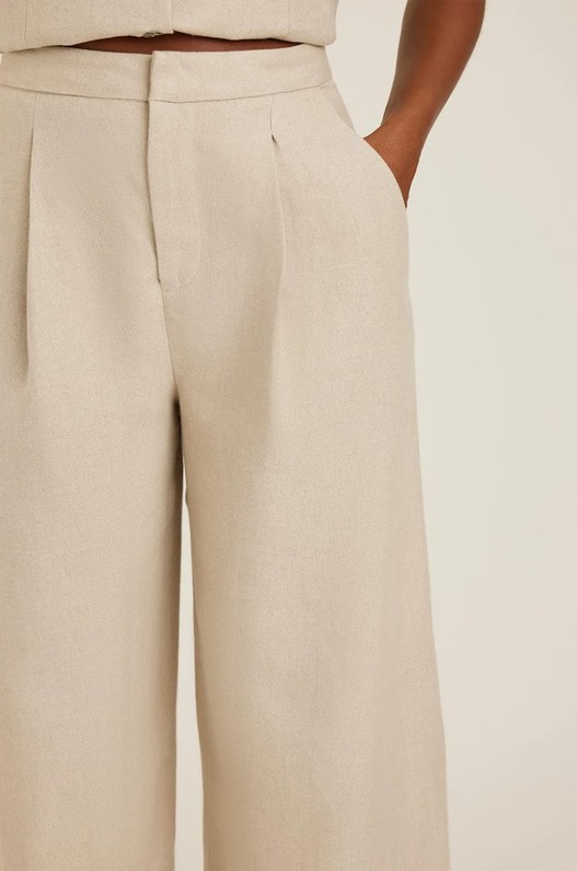 Calça pantalona de linho no tom Natural, com pregas na frente, fechamento com colchete interno no cós e zíper. Ideal para o dia a dia, quando combina com uma peça no mesmo tom Natural.