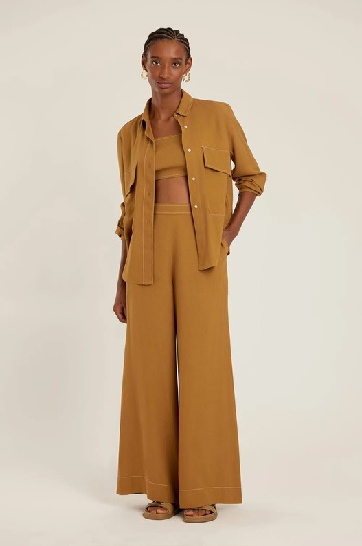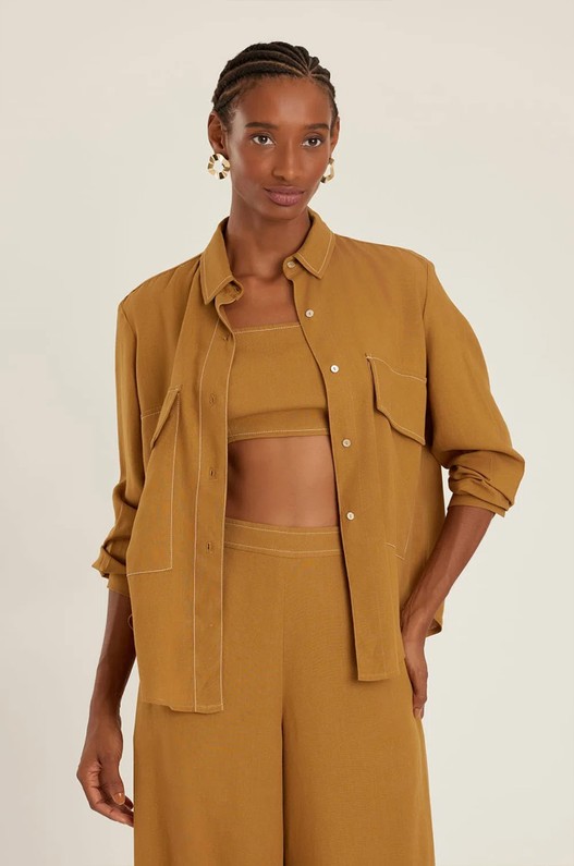 ÂMBAR: Inspirado na pedra orgânica, a cor traz sofisticação com a lycra com brilho texturizada e detalhes de pesponto nas roupas.