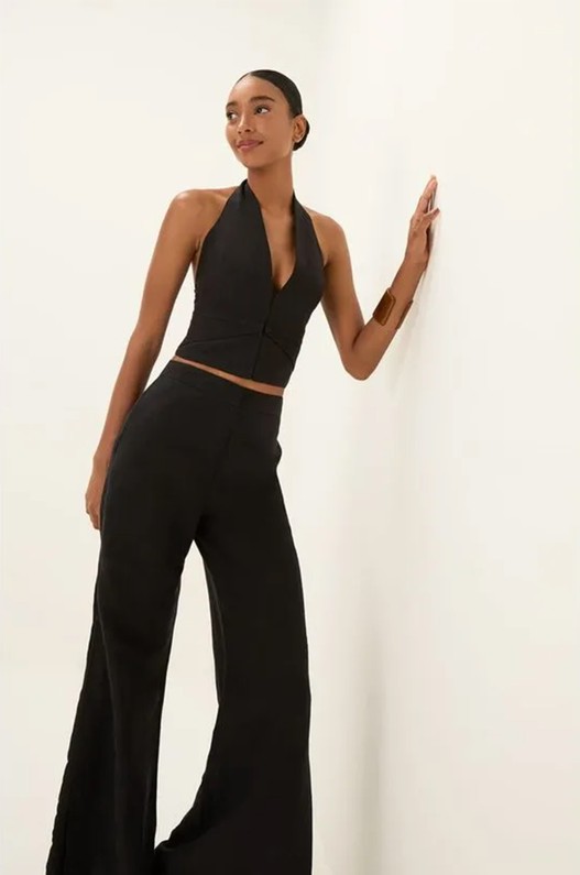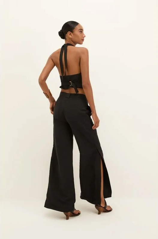 A calça preta Tacy tem shape leve, com pernas soltas e fendas laterais transpassadas que adicionam movimento ao look.