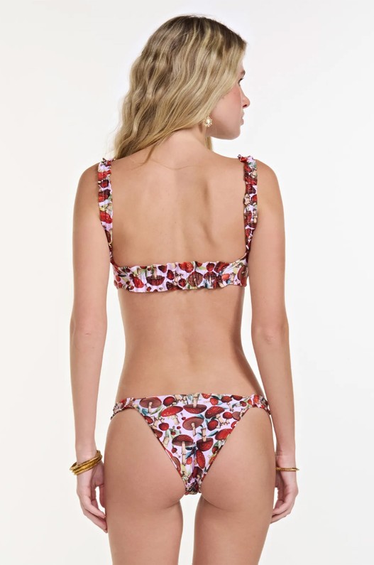 Biquíni estampa digital Cogumelo Alto Verão 2026 com proteção UV50+. A calcinha versátil com laterais drapeadas e pode ser usada também como asa delta, valorizando a silhueta e adaptando-se ao estilo desejado.