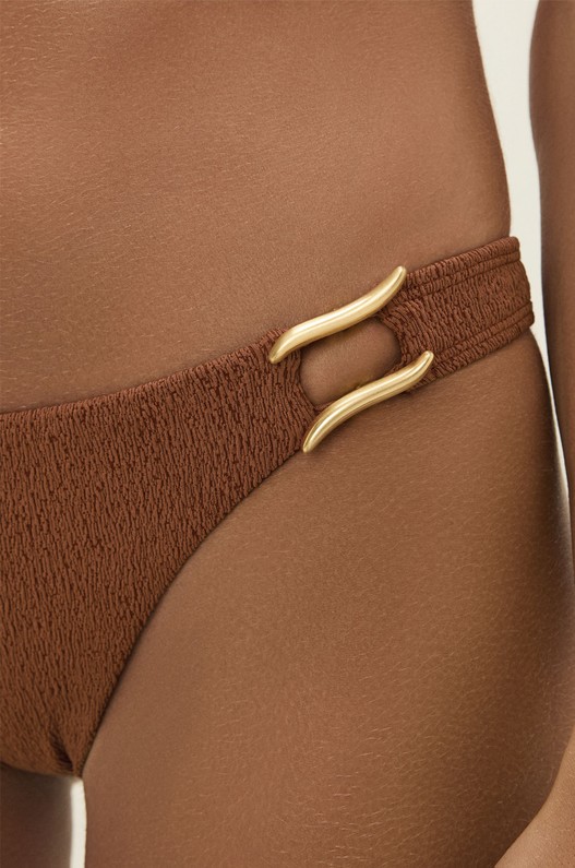 A calcinha de biquíni marrom tem tiras finas e estreitas sem regulagem. A cobertura BR com costura. Pode ser usada mais alta ou mais baixa.