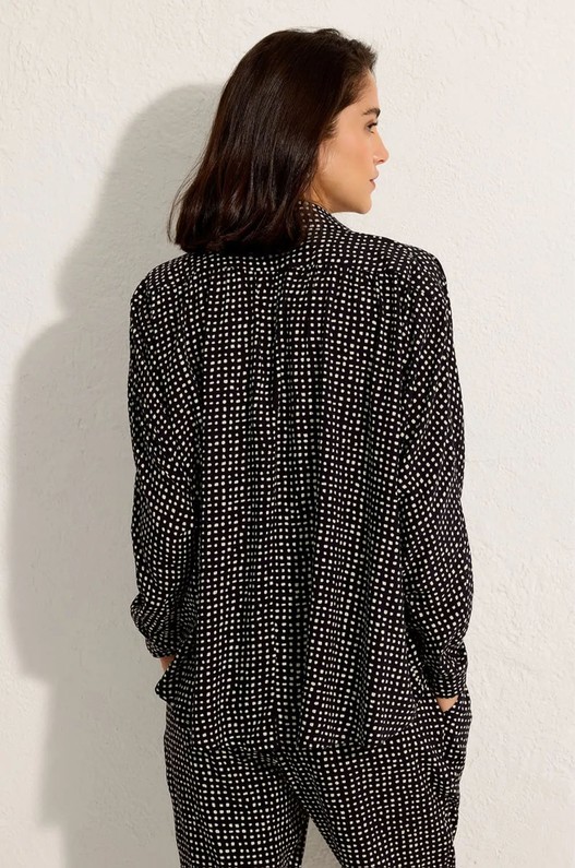 - Tem modelagem ampla com pala nos ombros e delicado franzido que confere movimento e leve volume;