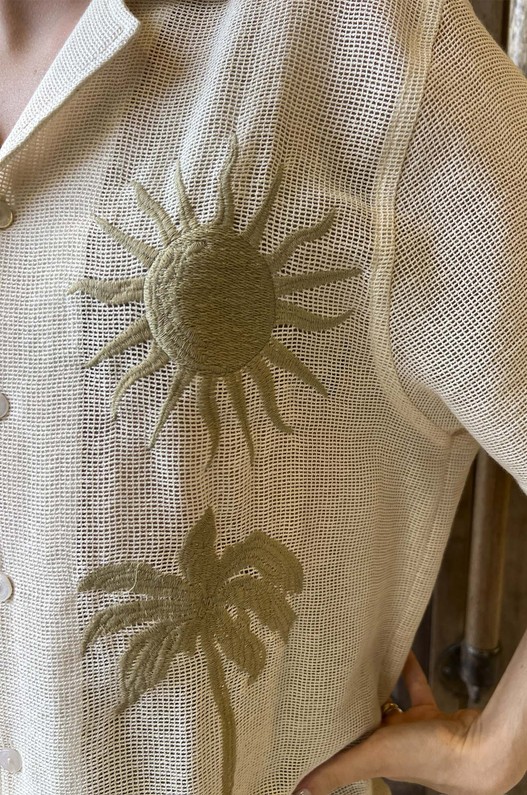 A Camisa Manga Curta Tela Natural, feita em tecido telado veleiro, apresenta gola sport e mangas curtas, criando um visual casual e sofisticado. A tapeta com botões de massa e as costas com pala garantem um acabamento refinado, enquanto os bordados frontais em formato de sol e coqueiro trazem um toque exclusivo e vibrante à peça. A placa de couro personalizada nas costas adiciona sofisticação e identidade à camisa.