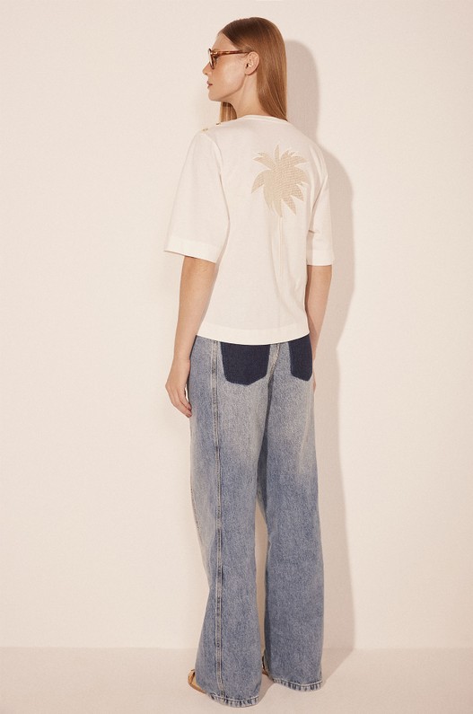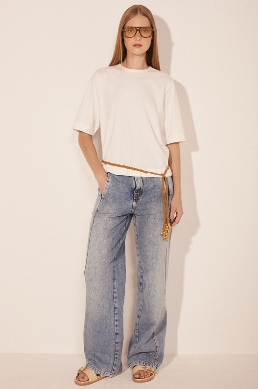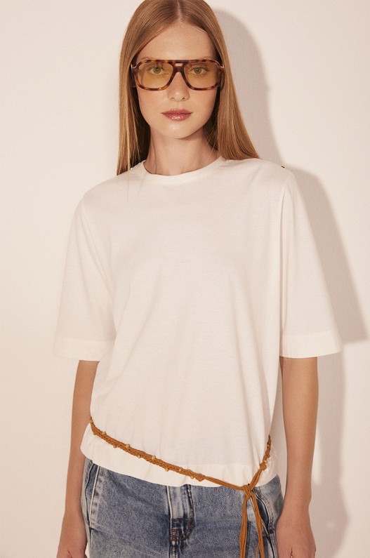 A Camiseta Manga Curta Essência Off White, feita em malha de algodão, apresenta gola careca em ribana e mangas curtas, criando um visual confortável e casual. A estampa vazada com tela nas costas e os rebites dourados nos ombros adicionam um toque moderno e sofisticado à peça, tornando-a perfeita para looks descomplicados, mas cheios de estilo.