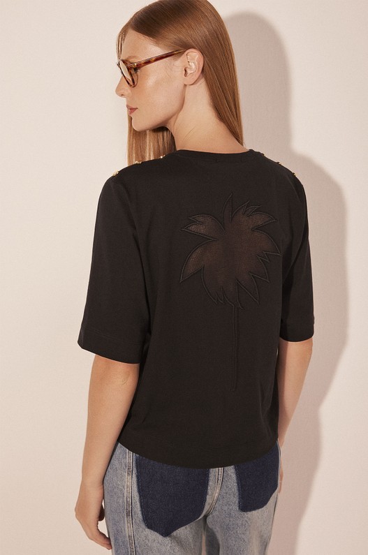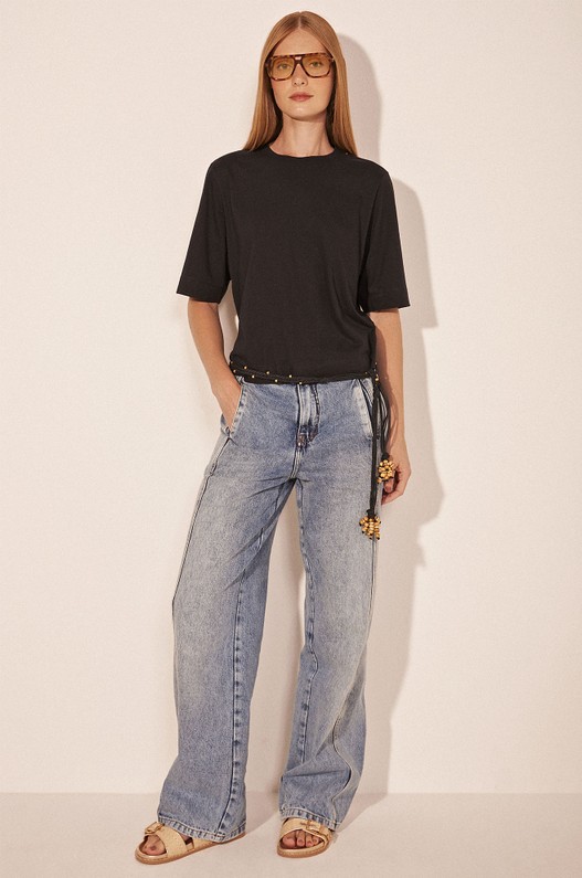 A Camiseta Manga Curta Essência, feita em malha de algodão, apresenta gola careca em ribana e mangas curtas, criando um visual confortável e casual. A estampa vazada com tela nas costas e os rebites dourados nos ombros adicionam um toque moderno e sofisticado à peça, tornando-a perfeita para looks descomplicados, mas cheios de estilo.