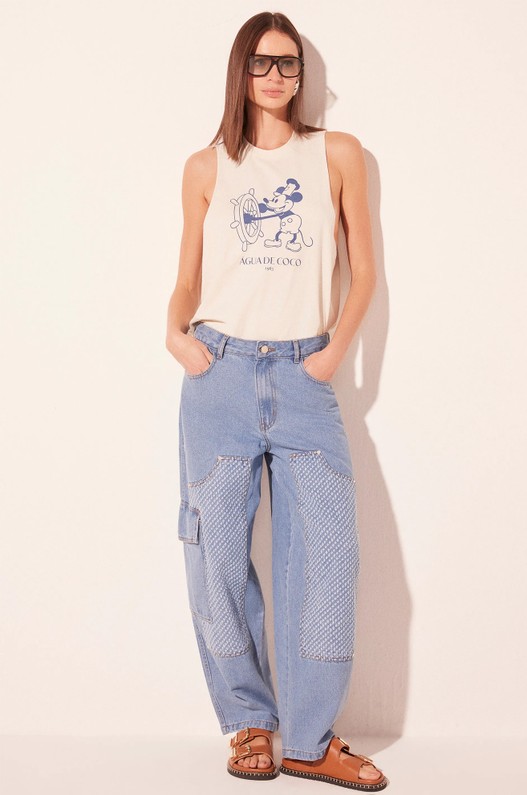 A Camiseta Regata Âncora Off White, em malha de algodão estonada, traz modelagem relaxed que combina conforto e estilo casual. A gola em ribana e a cava a fio com acabamento em trançadeira reforçam o visual despojado, enquanto a barra larga garante estrutura e caimento leve. O silk do Mickey Disney na frente adiciona um toque divertido e nostálgico, traduzindo a essência descontraída e sofisticada da ÁGUA DE COCO.