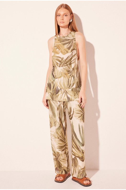 A Camiseta Regata Copa Palmeiras, em viscose lurex, traz modelagem alongada com cava extra baixa e decote redondo que proporciona caimento moderno e descomplicado. As fendas laterais e as pences transversais no busto oferecem ajuste delicado, enquanto os rebites aplicados nas laterais acrescentam um toque contemporâneo. A estampa de folhagens verdes sobre o fundo off white completa o visual com elegância tropical e brilho sutil.