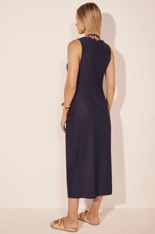 A Capa Midi Carpas, confeccionada em Lycra Touch UV50, tem comprimento midi e modelagem reta, afunilando para a barra. A modelagem regata cavada e a amarração no centro completam o visual, proporcionando um ajuste fluido e elegante.