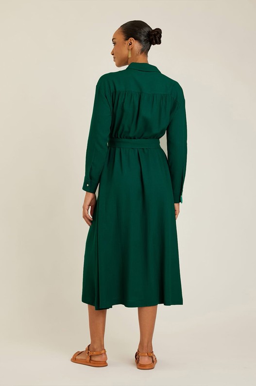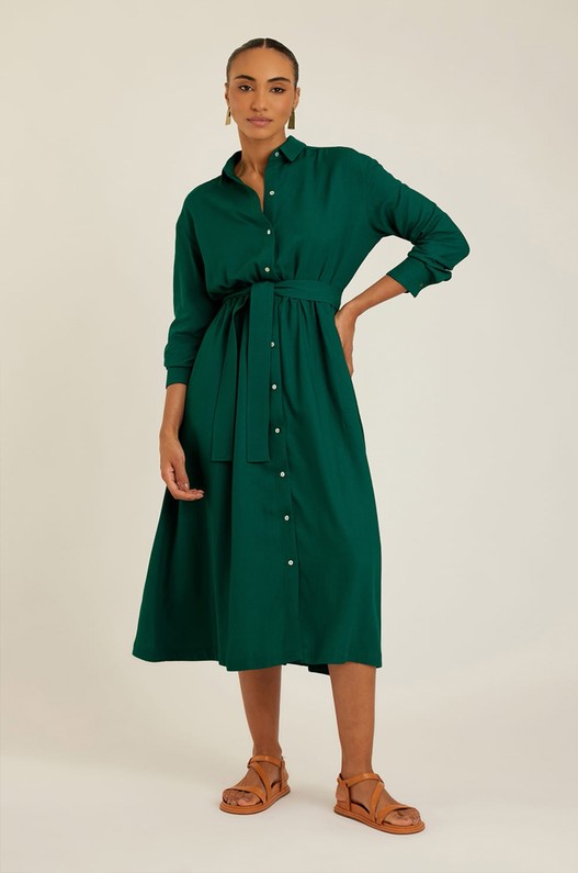 Chemisier de viscose com linho liso com amarração na frente, no clássico verde-floresta. O chemisier de linho tipo pareô possui comprimento midi, sendo uma peça que traz versatilidade, perfeita para o dia a dia.