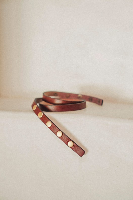 Cinto fino feito em couro, com rebites dourados e fechamento com botão de pressão.