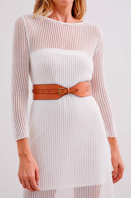 • Cinto largo, em couro, com faixa fina em coro transpassando e fechamento em fivela dourada.