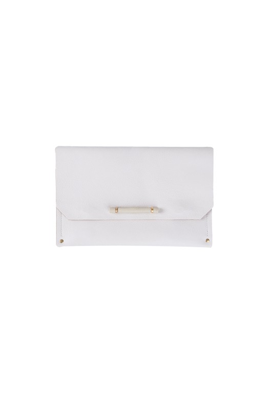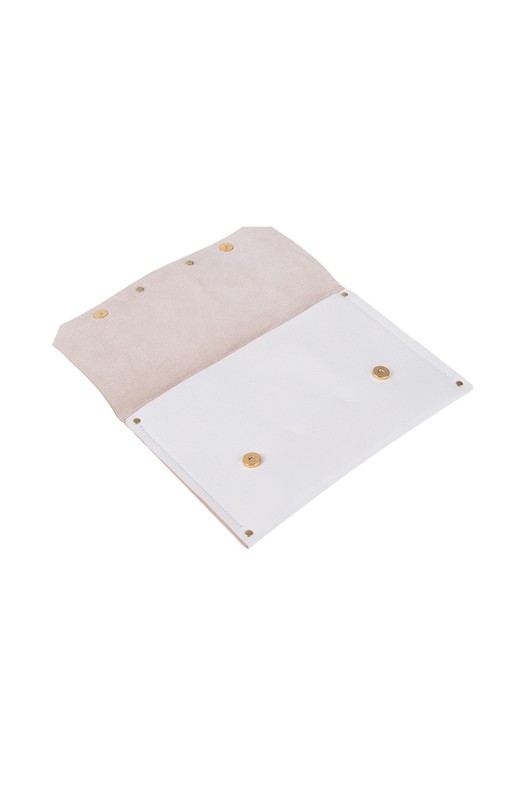 Bolsa Clutch, feita em couro, com formato retangular e detalhe de resina com metal banhado a ouro