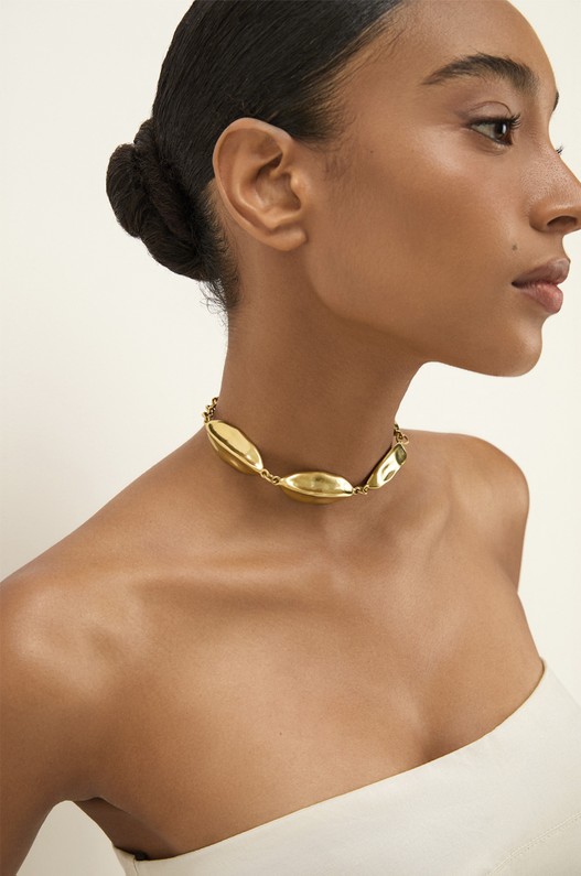 Em shape inspirado em elementos orgânicos, o colar Caroline apresenta textura levemente amassada no metal dourado, trazendo um toque de sofisticação ao visual. Perfeito para usar sozinho ou em composições, é uma peça versátil para diferentes estilos.