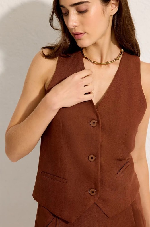 Colete alfaiataria, feito em linho com viscose. Tem proposta atual e versátil, com abotoamento frontal que permite usá-lo fechado como peça principal ou aberto em sobreposições. Combina elegância e leveza para looks de verão mais estruturados.