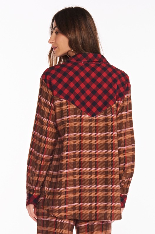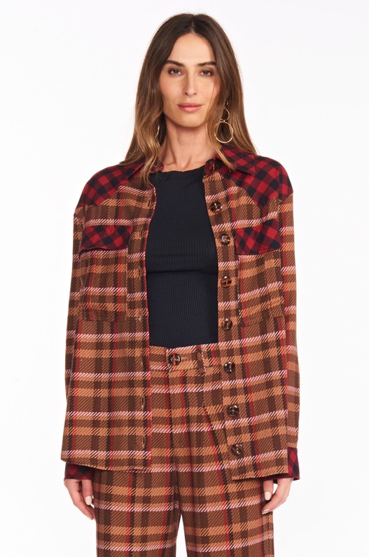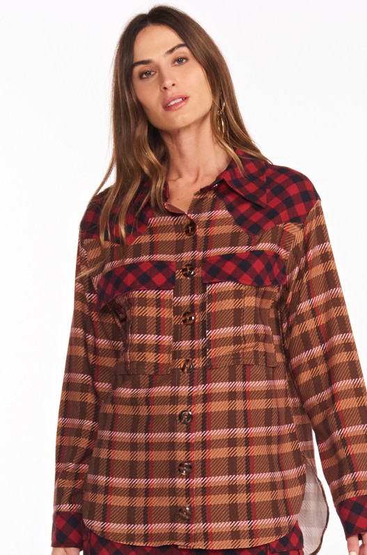 Tecido estampado digitalmente. Jacket camisa manga longa, comprimento com barra curva e com botões detalhe mix de estampas. Tecido estampado digitalmente.