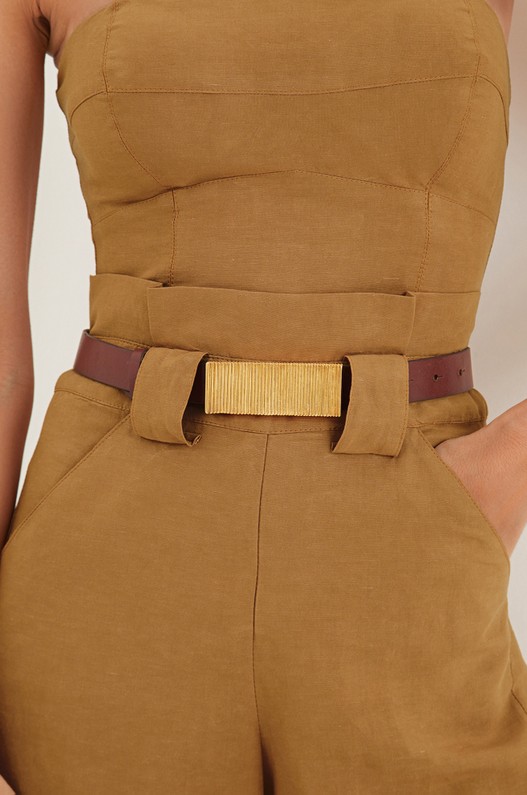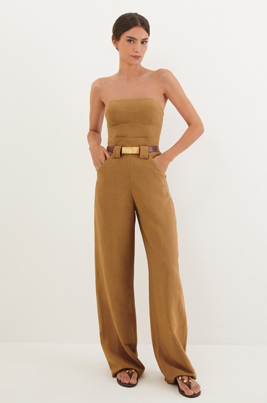 Em equilíbrio perfeito entre o moderno e atemporal, o macacão bege Iuna é uma peça para ter por diversas temporadas. Experimente usá-lo com sandálias, bolsas e outros acessórios ViX. - Detalhe imitando efeito clochard na cintura - Acompanha cinto com fivela de metal dourado - Sem alça - Decote reto - Recorte no busto e na calça - Bolsos - Zíper e lastex nas costas Detalhes feitos à mão no ateliê ViX