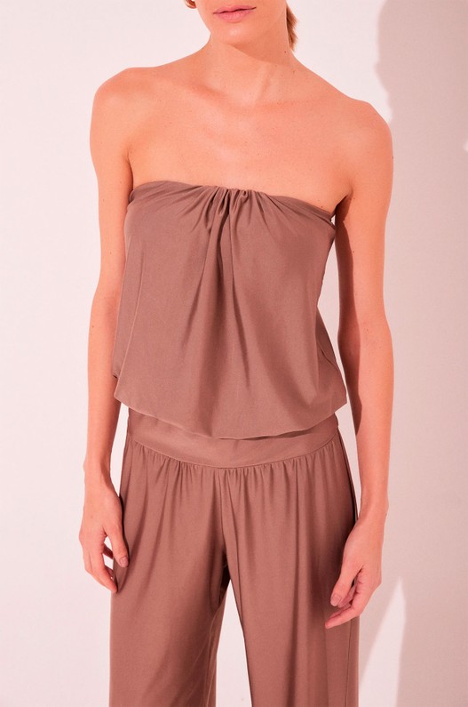 Confeccionado em lycra touch com proteção UV50, ele une funcionalidade e estilo para diversas ocasiões. Sem alças, o macacão apresenta uma pala no busto com franzido central e uma cintura baixa com pala franzida, que valorizam a silhueta de forma delicada.