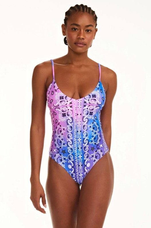 Maiô dupla face localizado alça fina com regulagem, decote v frontal e costas cavada. Tecido estampado digitalmente. Peça exclusiva oficial Collab NV+TRIYA