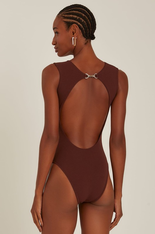Maiô com decote bateau, bojo removível e recorte na frente. Nas costas tem fechamento com ferragem mosquetão personalizada no banho níquel e decote profundo. Possui modelagem elegante que traz modernidade no look da praia. Traz versatilidade, você também consegue usar sobrepondo com uma calça para uma produção de final de tarde. Feito em lycra texturizada, faz parte da collab Lenny + Misci.