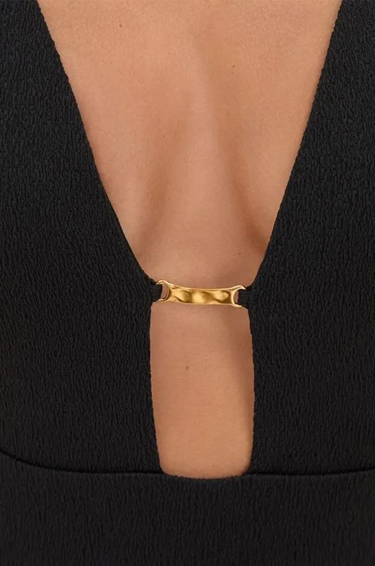 O maiô preto com a modelagem Elisa traz decote marcante, ombro alongado e detalhe de metal dourado no centro do busto. Recorte na cintura, alças paralelas, cava alta e decote nas costas completam o design cheio de bossa.