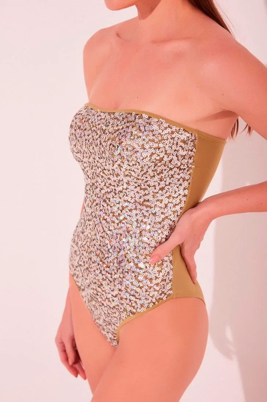 Confeccionado em tule paetê holográfico com detalhes em lycra lisa verde, ele combina ousadia e sofisticação. Com bojo removível para maior conforto e versatilidade, apresenta paetês por toda a frente que refletem a luz de forma deslumbrante, enquanto as costas lisas equilibram o design.