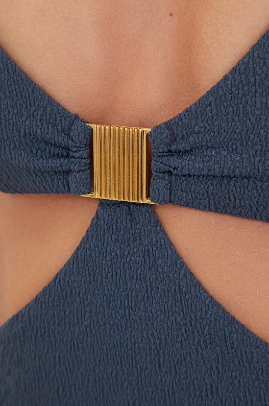 • Bold, mas ainda clássico, o detalhe Becky tem um cubo metal dourado com textura em listras verticais no centro do busto. Textura exclusiva Firenze, uma lycra especial creponada opaca que empresta para a moda praia características do algodão e do linho.