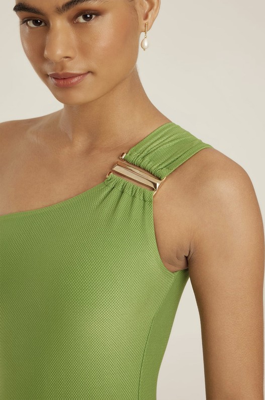 Maiô de um ombro só com acessório em metal dourado. Possui bojo removível. Lycra texturizada com proteção UV FPU 50+. O maiô de um ombro só traz sofisticação e transita também para ocasiões urbanas.