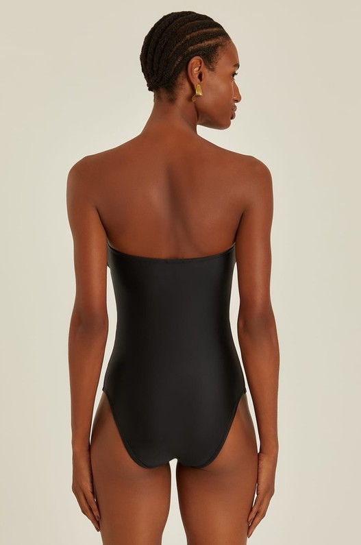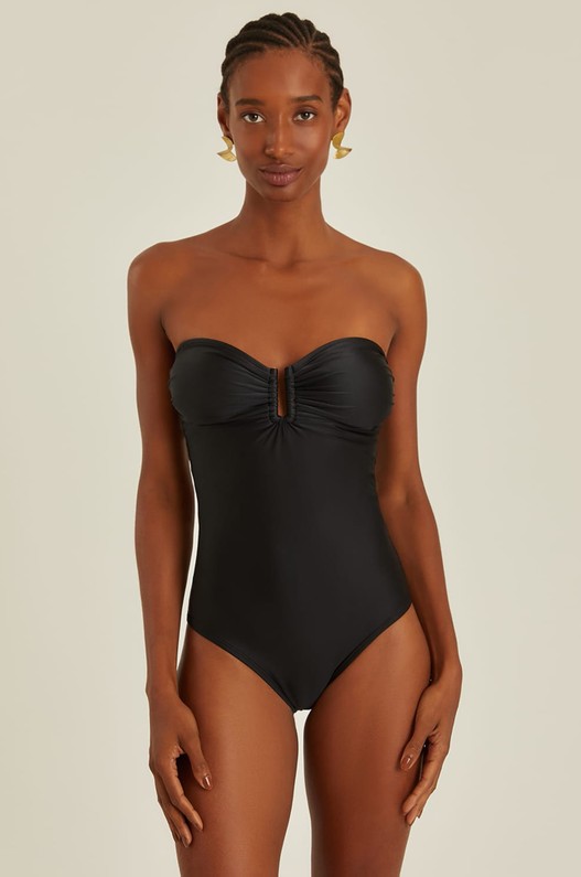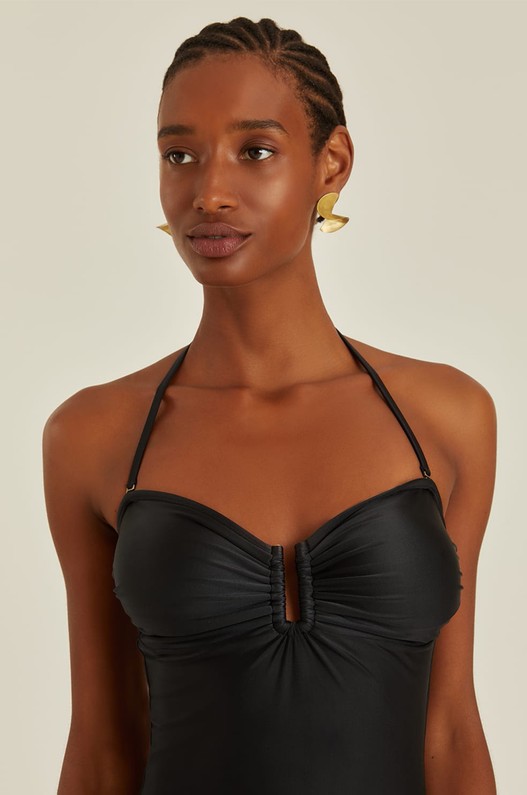 Maiô tomara-que-caia com detalhe em U no banho ouro velho e estrutura interna que ajuda na sustentação do busto. Possui alça removível e bojo também removível. Lycra com proteção UV FPU 50+. Traz sofisticação para o look praia. Modelo veste tamanho P.