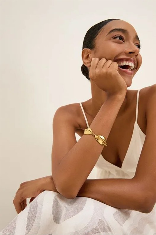 Desejo da temporada, a pulseira Caroline apresenta elementos orgânicos de textura levemente amassada em metal dourado. Com design único, traz sofisticação e leveza para produção, sendo perfeita para compor diferentes produções.