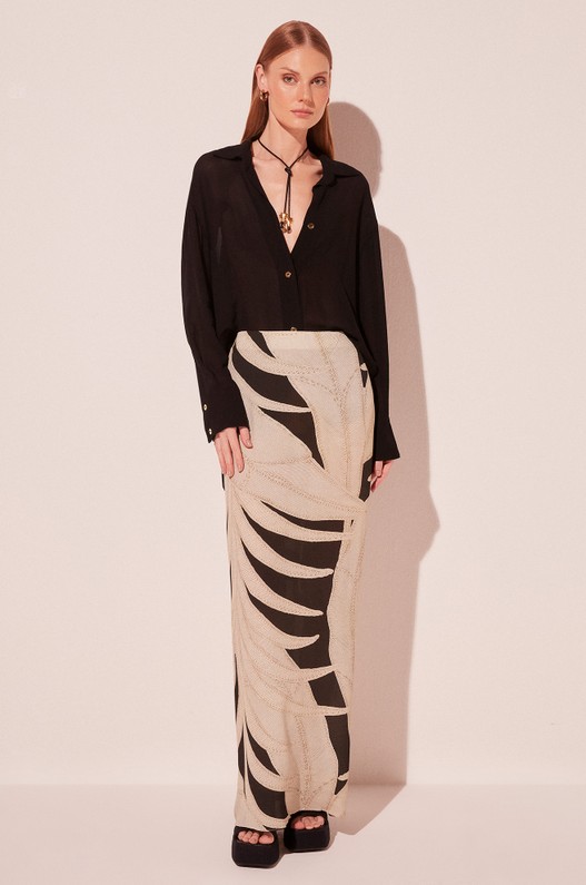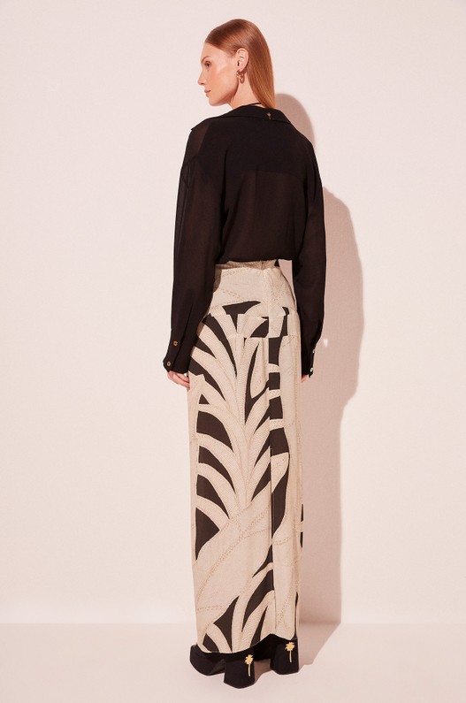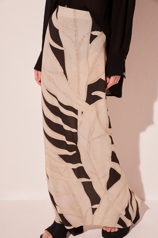 A saia longa do Mix folhas bicolor é a epitome da elegância atemporal. Confeccionada em viscocrepe de chine, esta peça exibe uma estampa sofisticada de folhas beges bordadas sobre um fundo preto, ideal para ocasiões especiais. O design sem costura lateral e o zíper invisível proporcionam um caimento impecável, enquanto a fenda nas costas adiciona um toque feminino e moderno. Para um visual completo e refinado, combine-a com a blusa frente única folhas bordadas.