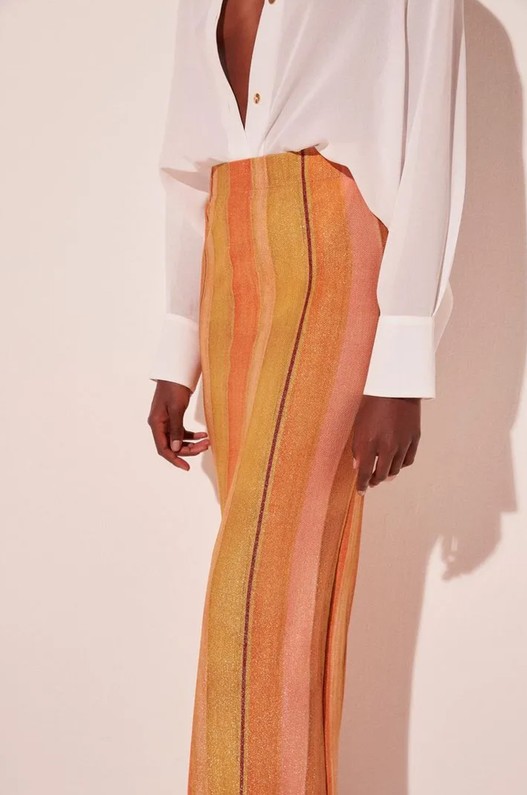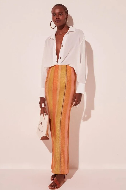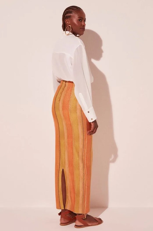 A saia longa do Mix Listra Pincelada, confeccionada em Viscose Lurex, é a escolha ideal para quem busca um look sofisticado e elegante. Com modelagem reta e uma fenda no centro das costas, oferece um caimento impecável e confortável. Os botões no decote das costas adicionam um toque refinado, enquanto a estampa listrada em tons de laranja proporciona um visual vibrante e moderno.