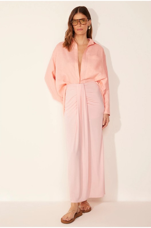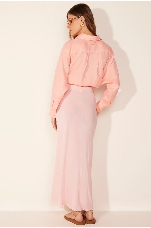 A Saia Longa Malta Rosa, feita em visco jersey, apresenta comprimento longo e um detalhe de cintura drapeada com franzido, proporcionando um visual fluido e elegante. As costas com recorte e a fenda trazem um toque sensual e moderno, tornando a peça ideal para looks sofisticados e contemporâneos.