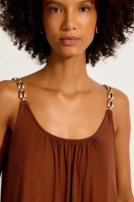 Saída de praia, feita em lycra. Tem modelagem cropped, decote em U com franzido, além de detalhe de aviamento em metal nas alças. Com caimento leve e toque moderno, é ideal para sobrepor aos biquínis e maiôs, elevando o visual pós-praia com praticidade e charme.