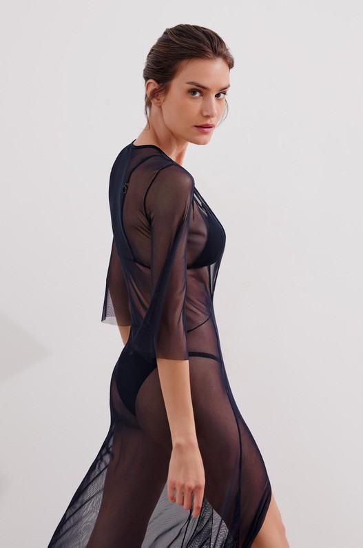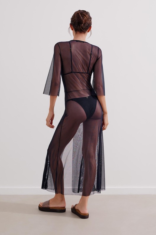 Saída longa em tule, com decote profundo, recorte e fendas na frente e manga longa.