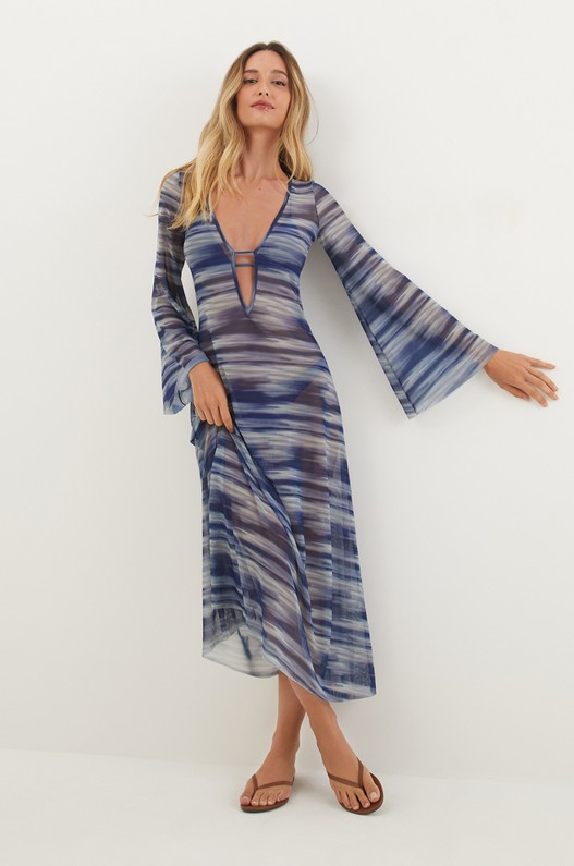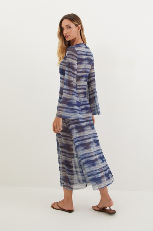 A estampa Moonlight, um degradê de azuis e branco com fios de lurex prata, tem inspiração no reflexo da lua no mar à noite. Saída de praia azul estampada em tecido fluido. Opção leve e versátil: use com seu biquini preferido, sandálias flats, bolsa de palha, chapéu e outros acessórios ViX. - Manga longa - Decote V - Recorte oval embaixo do decote