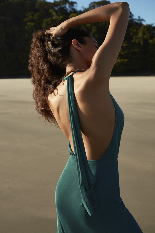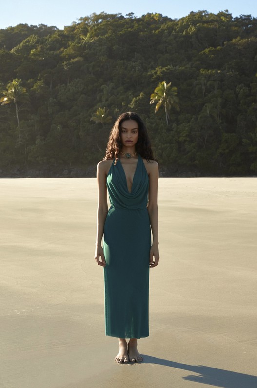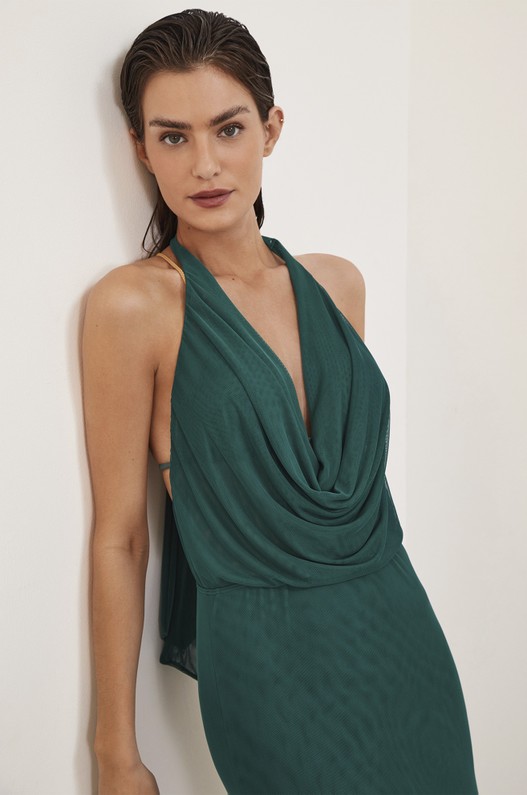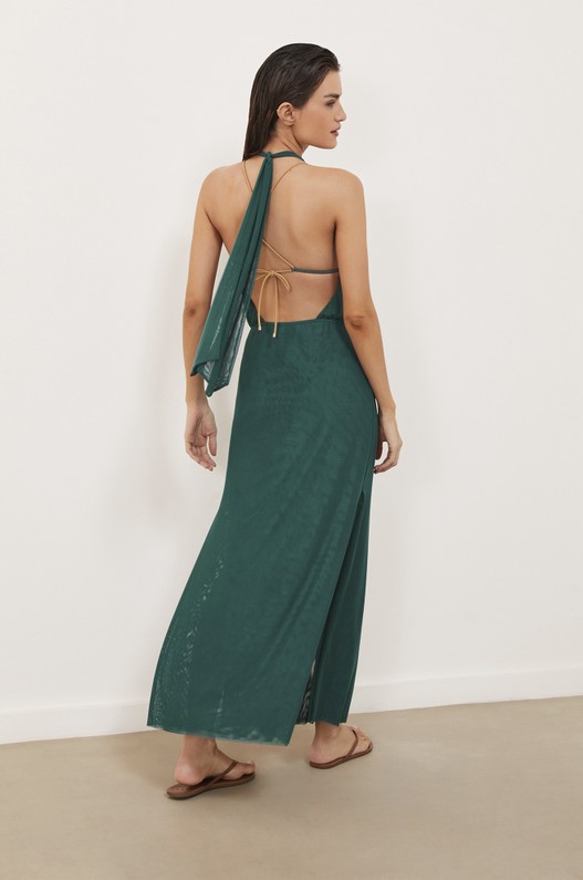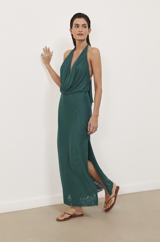 Saída de praia longa frente única em tule, ajustada ao corpo e com decote drapeado na frente. Amarração no pescoço e fendas laterais. Opção super versátil que pode ser usada de maneira casual com flats, ou em produções mais arrumadas com sandálias mais altas. Saida de praia, saida de praia verde.