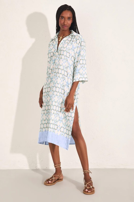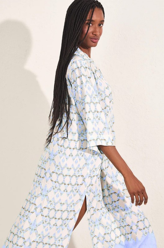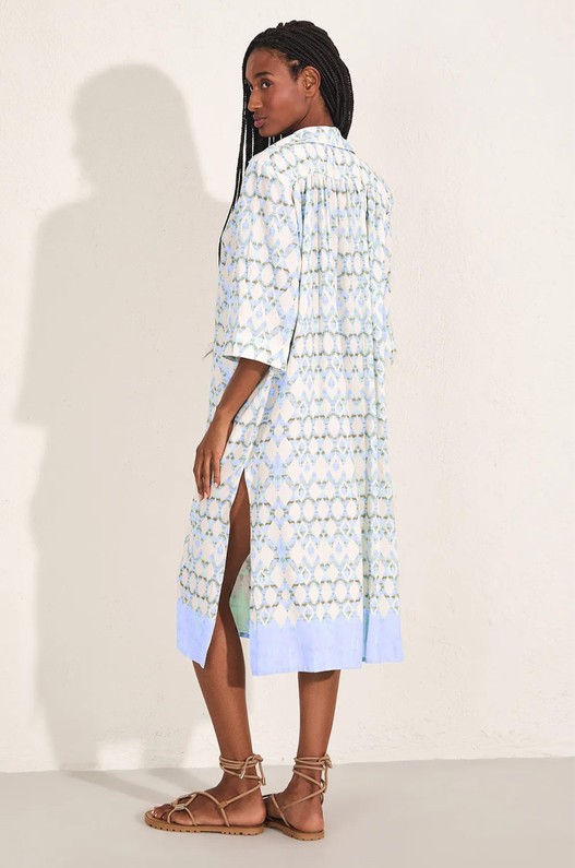• Saída, feita em cambraia de linho com viscose leve estampada
