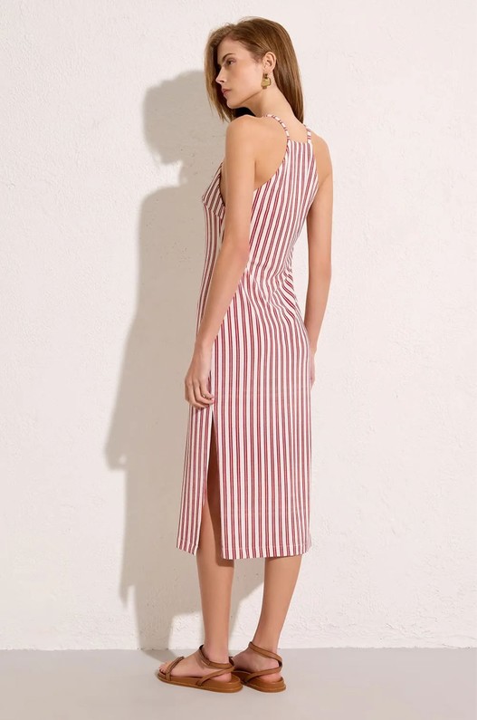 •Comprimento midi com fendas laterais e alças finas criam leveza e movimento.