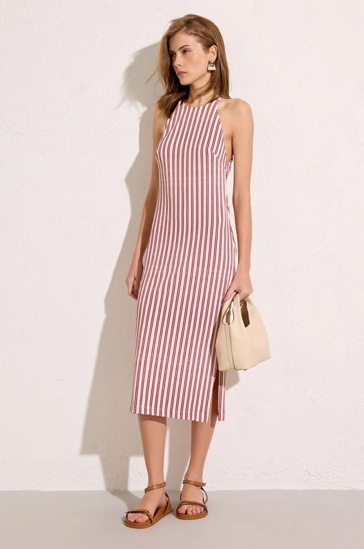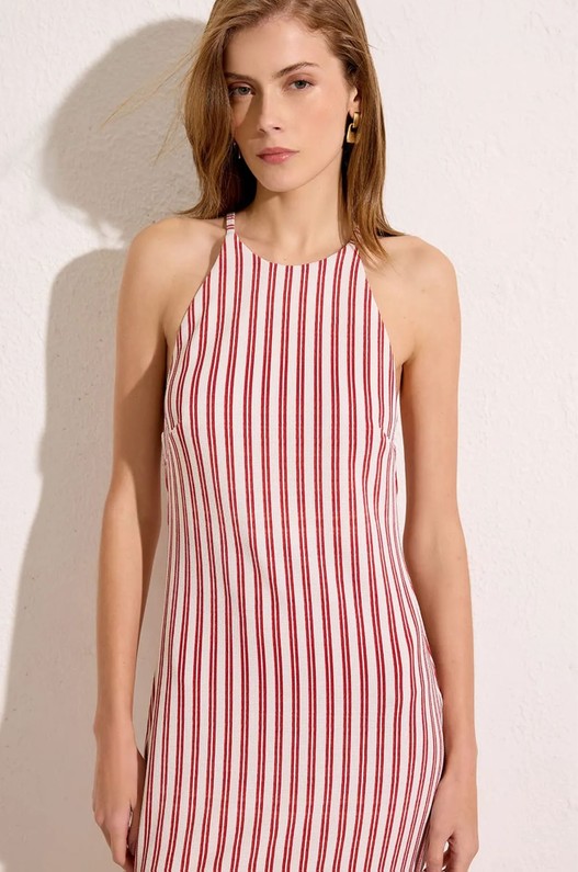 Saída Praia Listras em lycra estampada, com decote halter que valoriza o colo e modelagem reta ajustada ao corpo.