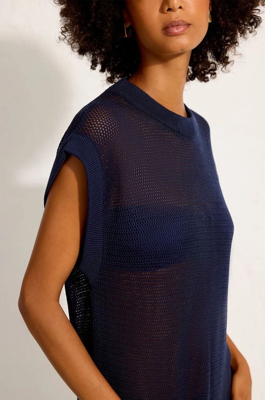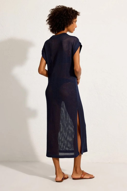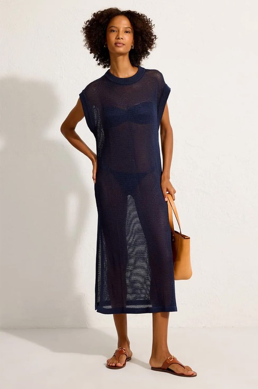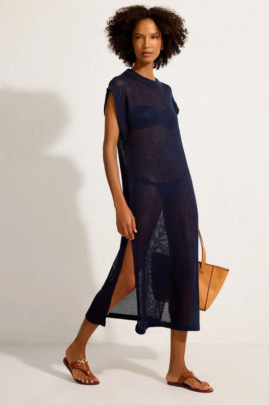 Saída de praia reta, feita em tricot. Possui decote careca, comprimento midi e fendas laterais, criando leveza e fluidez ao caminhar. Uma opção sofisticada para o pós-praia ou para sobrepor a peças ajustadas, compondo produções elegantes e descomplicadas.