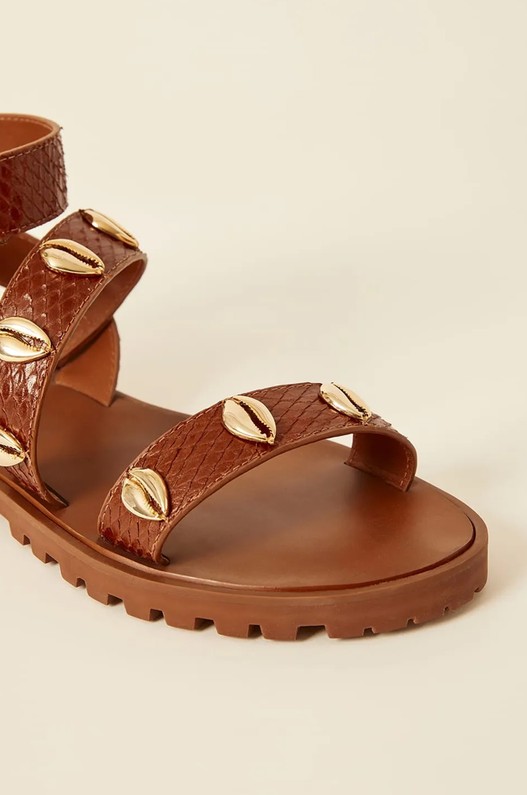 Sandália feita em couro gravado com enfeite de búzios em metal dourado. Apresenta fecho de velcro e solado de borracha garantindo conforto para o dia a dia. Possui tom caramelo e você pode usar a Sandália Búzios para compor elegantes e sofisticados looks.