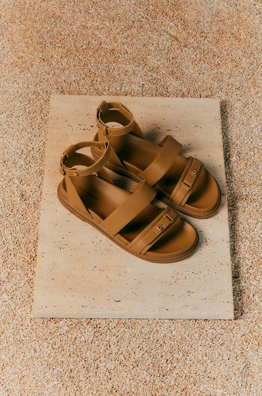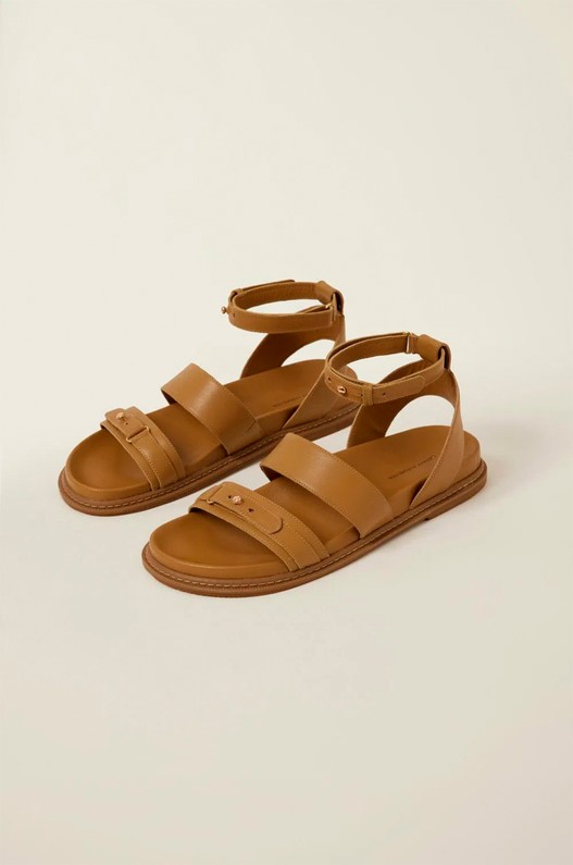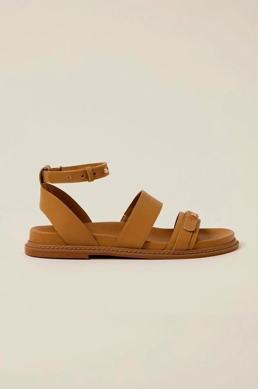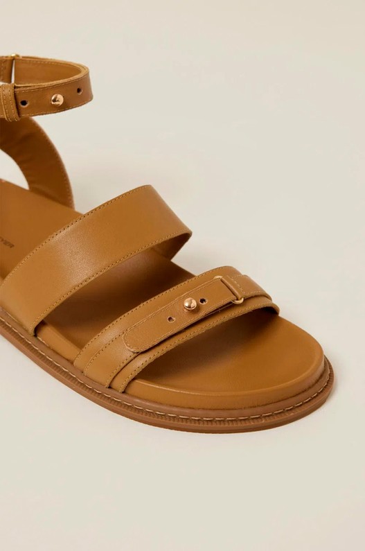 Sandália de couro, com fecho de carrapeta em metal. A sandália carrapeta possui palmilha conformada e solado de borracha, trazendo conforto. Sandália ideal para compor looks com peças midi ou curtas.